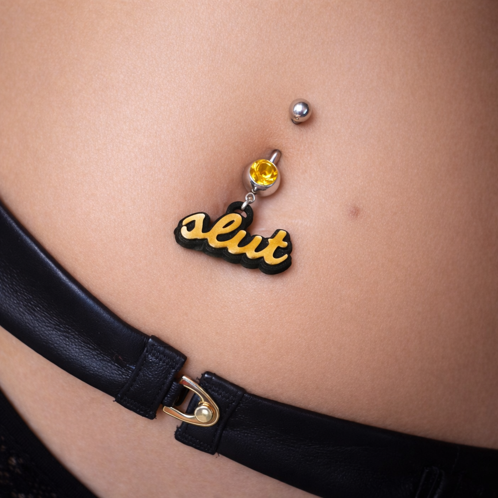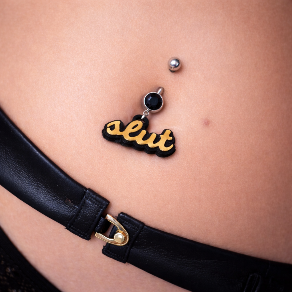 Affirmez fièrement votre féminité assumée et votre audace sans tabou avec ce piercing nombril « Slut », véritable symbole de liberté et de plaisir revendiqué. Pensé pour les femmes libérées et sûres d’elles, ce bijou au design provocateur est un clin d’œil complice à l’univers libertin chic.