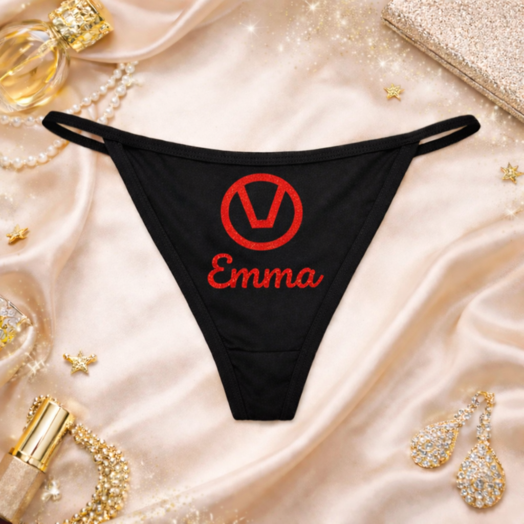 La pièce maîtresse est un string personnalisé avec prénom et symbole libertin, accompagné d’accessoires assortis pour compléter ce coffret unique.