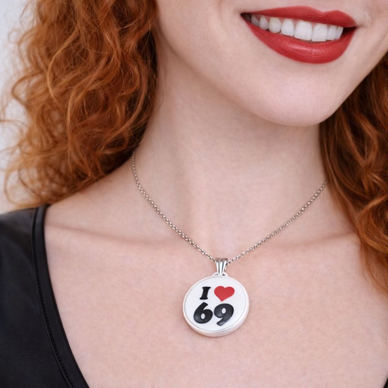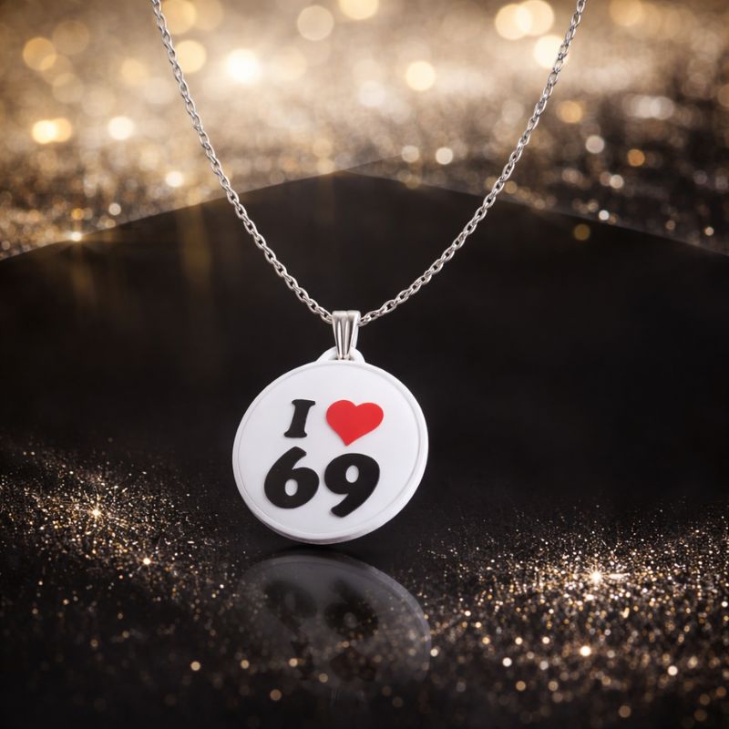 Sur un médaillon rond d’un blanc immaculé, le message « I love 69″ encadre un cœur rouge vibrant — une invitation visuelle assumée à l’exploration et à la liberté d’expression. -